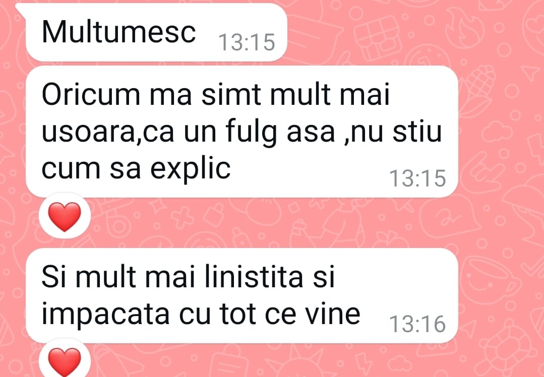 - vei căpăta claritate pentru următorii pași pe care îi ai de făcut către o viață trăită în ARMONIE si bucurie, in timp pentru a avea grija de tine