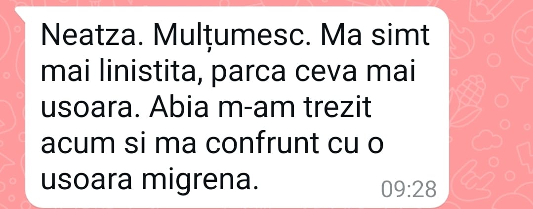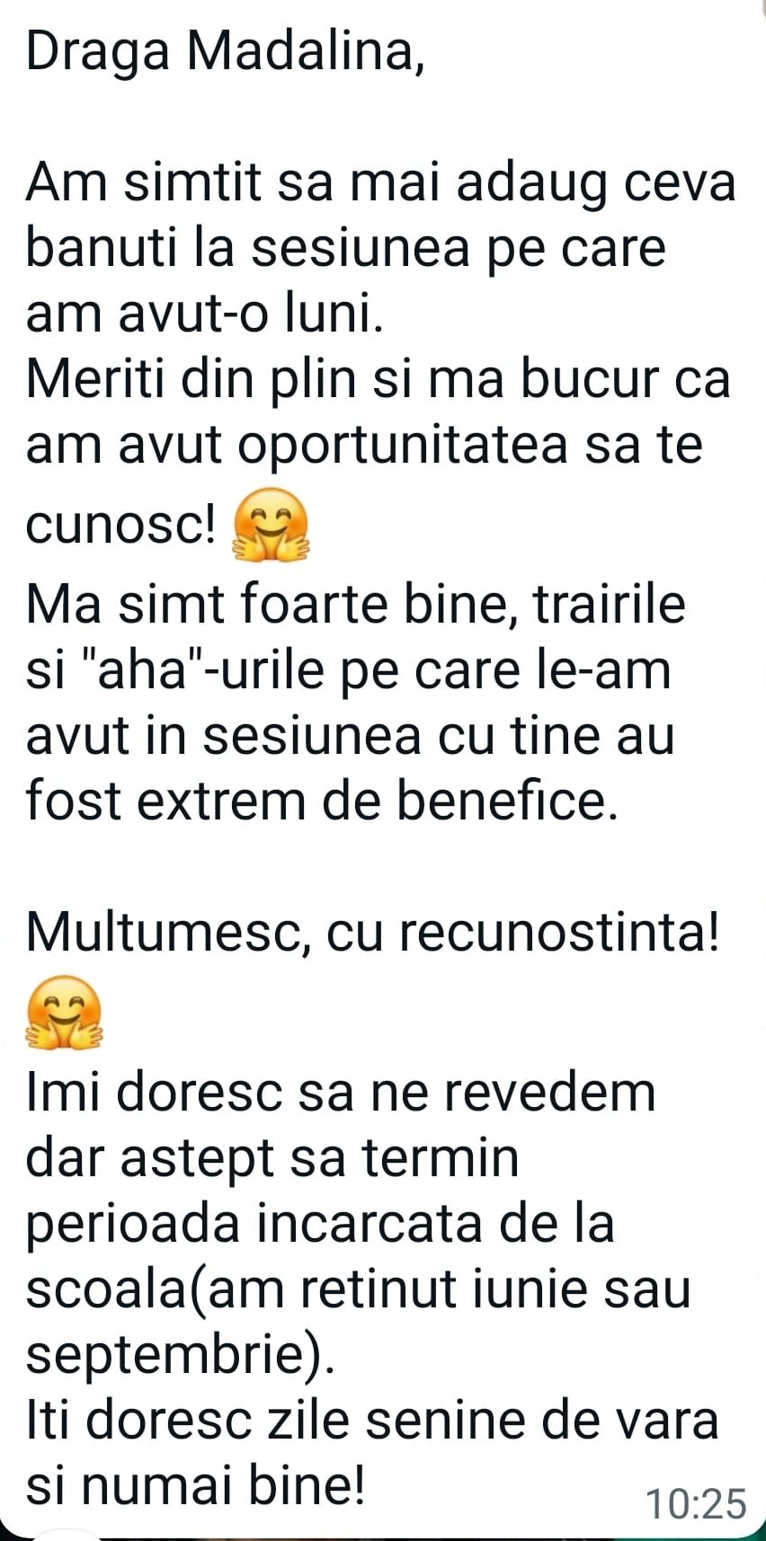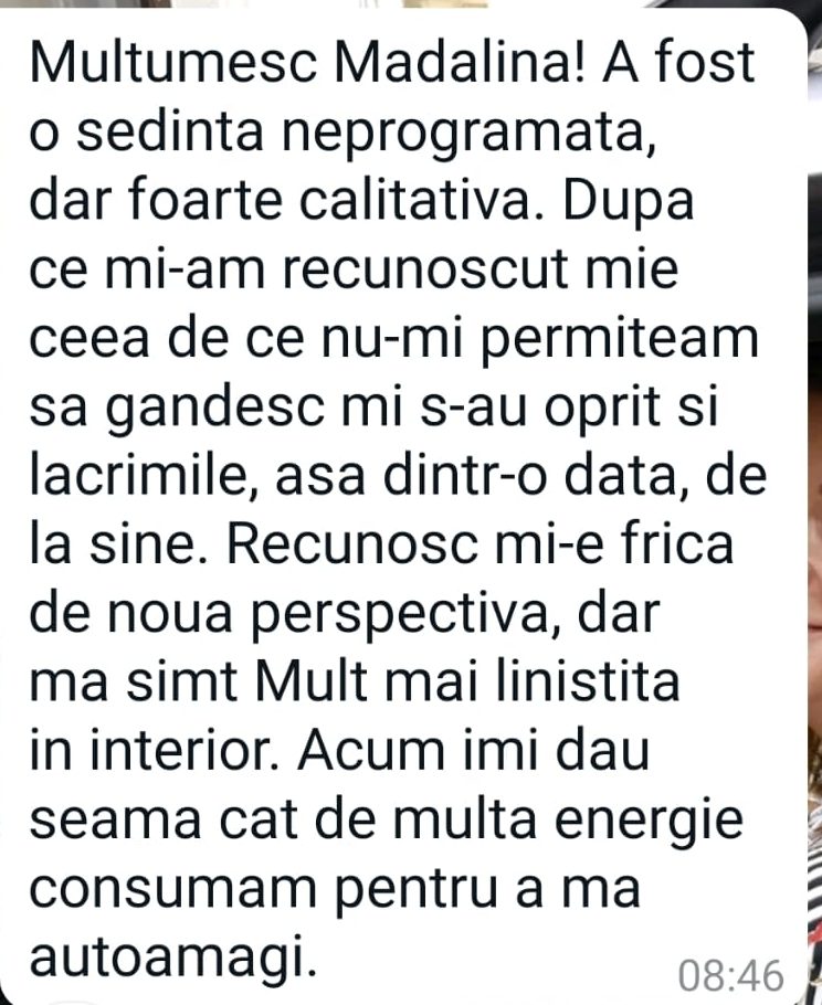 In unele cazuri, în funcție de context, facem împreună și o meditație ghidată sau o mini-sesiune terapeutică